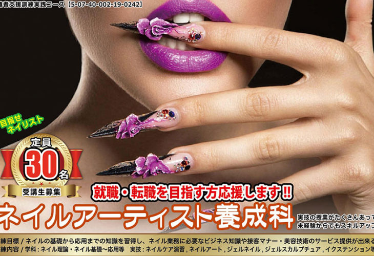 募集期間:2025年2月21日(金)〜2025年3月21日(金) ネイルの基礎から応用までの知識を習得し、ネイル業務に必要なビジネス知識や接客マナー・美容…